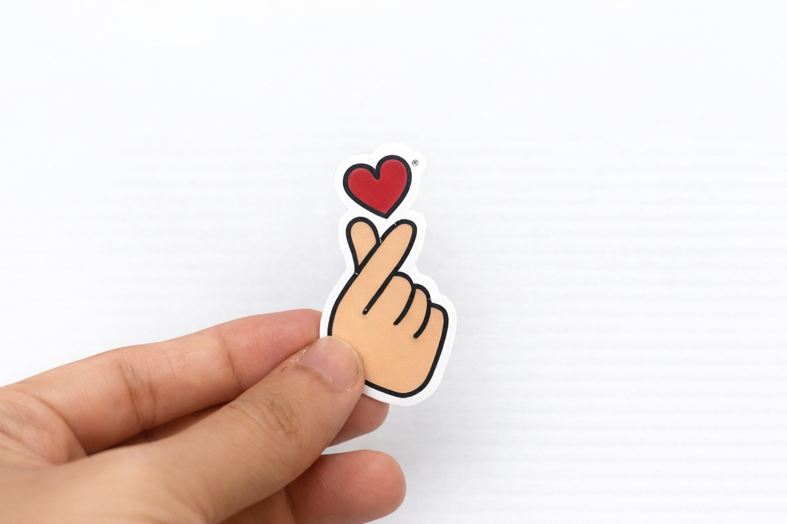 O imã tem formato de mão fazendo o gesto de coração, com cor clara para a mão e coração em vermelho destacado. O tamanho é pequeno, perfeito para decoração personalizada.