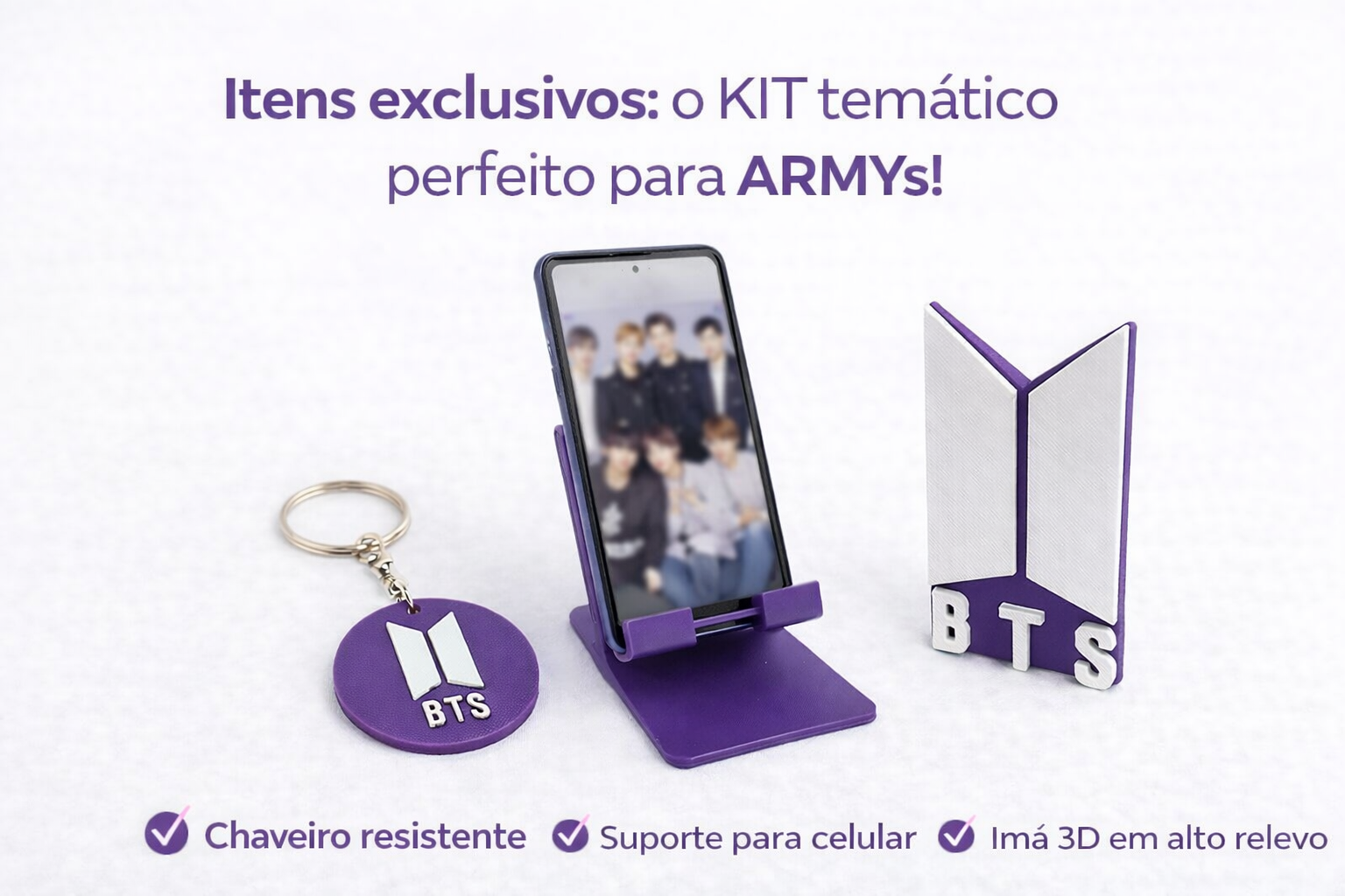 O kit reúne 3 produtos BTS, todos com design harmonizado na cor roxa e acabamento de qualidade, ideais para decorar, presentear ou colecionar.