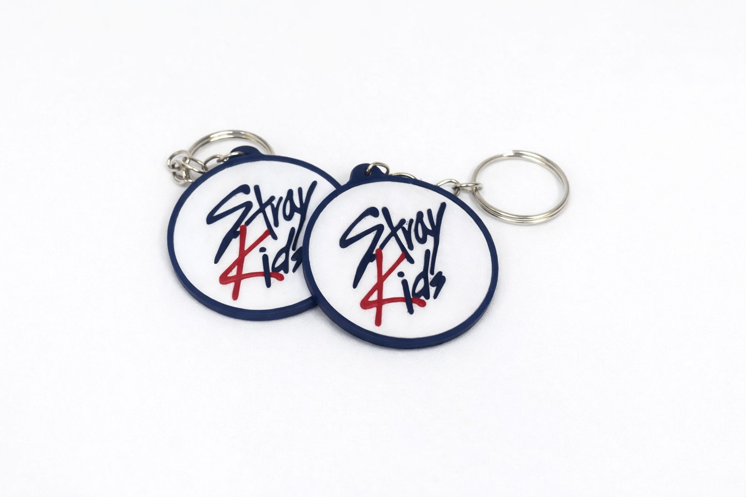 O chaveiro tem formato Redondo com predominância das cores branco e preto, com a escrita "Stray Kids" em destaque, feito em material plástico com argola metálica para fácil fixação. Produto ideal para fãs do grupo que querem um acessório prático e estiloso.
